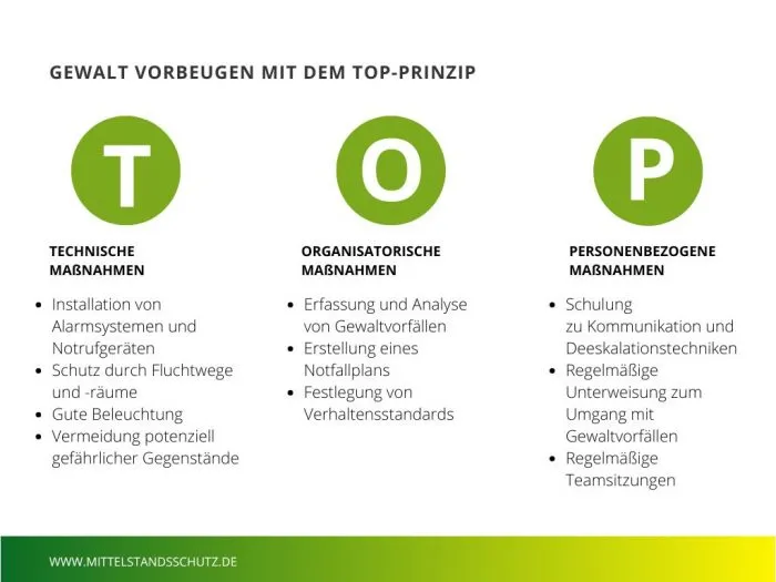 Bei der Implementierung von Schutzmaßnahmen gegen Gewalt kannst du dich am sogenannten TOP-Prinzip (technisch-organisatorisch-personenbezogen) orientieren. Technische Schutzmaßnahmen sind vor den organisatorischen Schutzmaßnahmen und diese wiederum vor den personenbezogenen Schutzmaßnahmen durchzuführen.